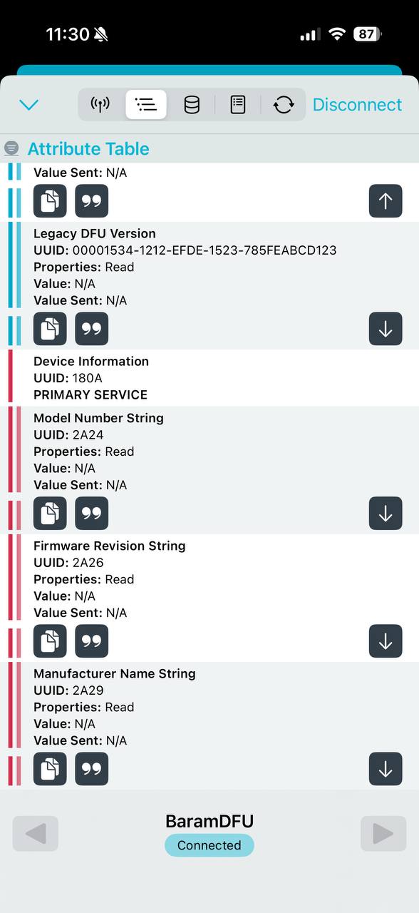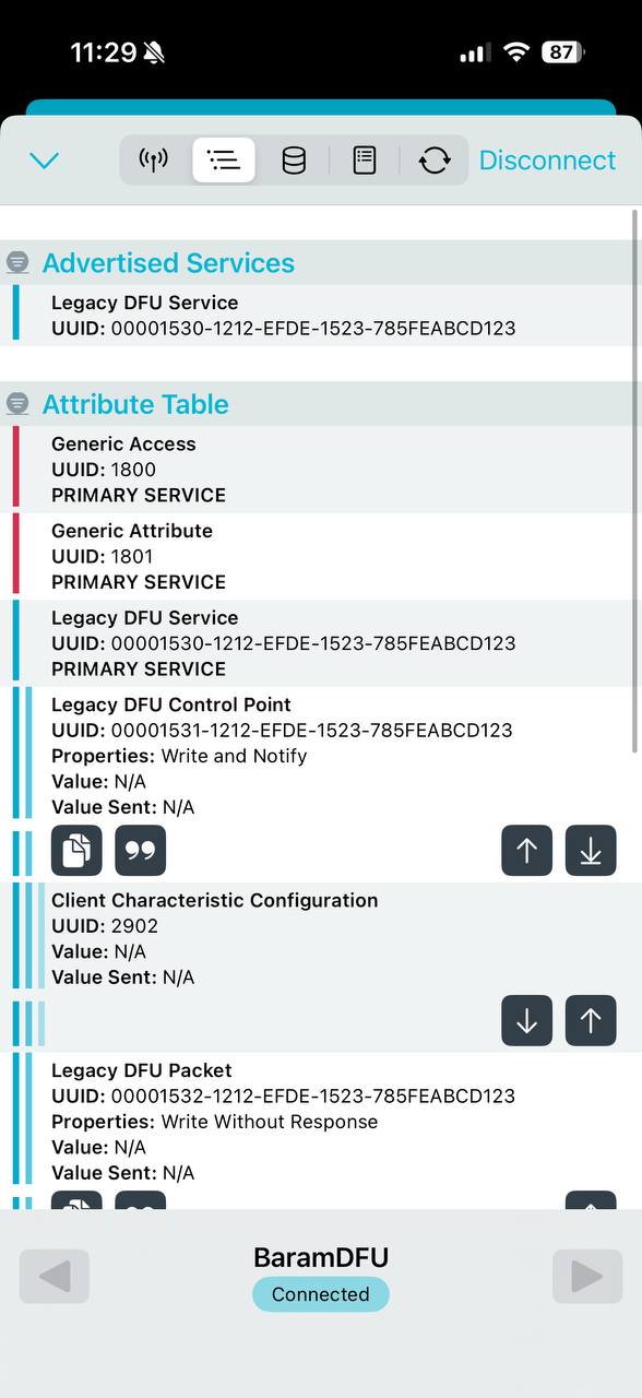 먼저 보드에 펌웨어 코드가 제대로 Flash 되지 않은 상태에서는 BARAM DFU라는 이름으로 nRF Connect 앱에서 잡힙니다.