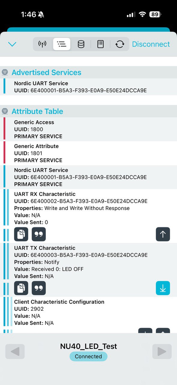 스마트폰 같은 Central 장치에서 “1” 또는 “0”을 전송하면 Peripheral(보드)가 이를 수신하여 NU40 DK의 LED1(13번 핀)을 켜고 끄는 간단한 원격 제어 프로그램입니다.