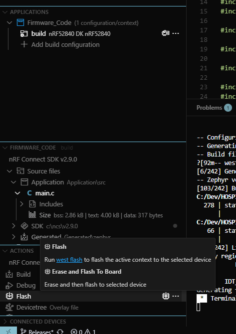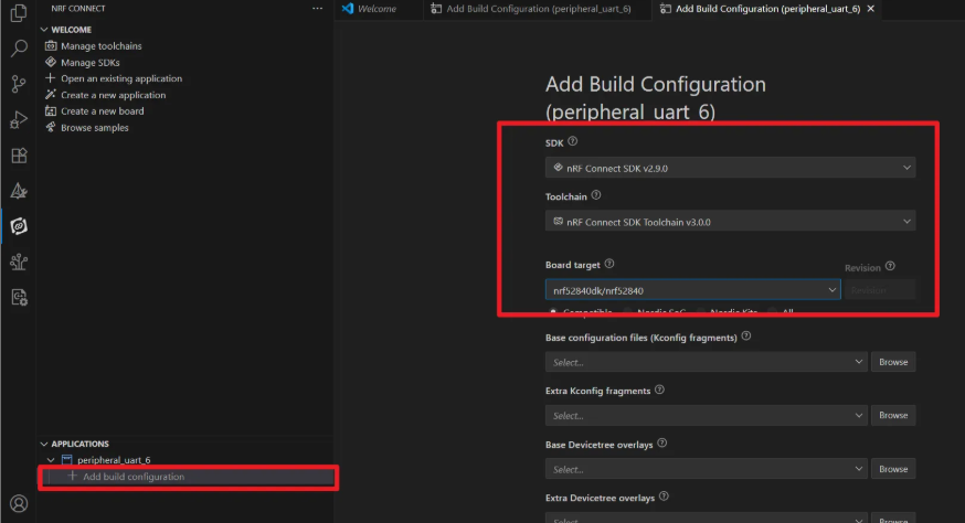 좌하단의 Add Configuration 누른 후, 우측에서 설치한 SDK 버전과 Toolchain 설정, 보드 nRF52840 설정 후, 빌드 진행